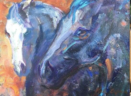 Love of horses and an intuitive understanding of their characters inspired her to draw and paint horses from early childhood. Her artistic expression over the years evolved from photo realistic portraits of the horse's physical beauty toward more abstract equine paintings that better captured their real essence and spirit. The deep understanding of their anatomy and their herd relationships that came from riding dressage and eventing add an intimacy to all her work.